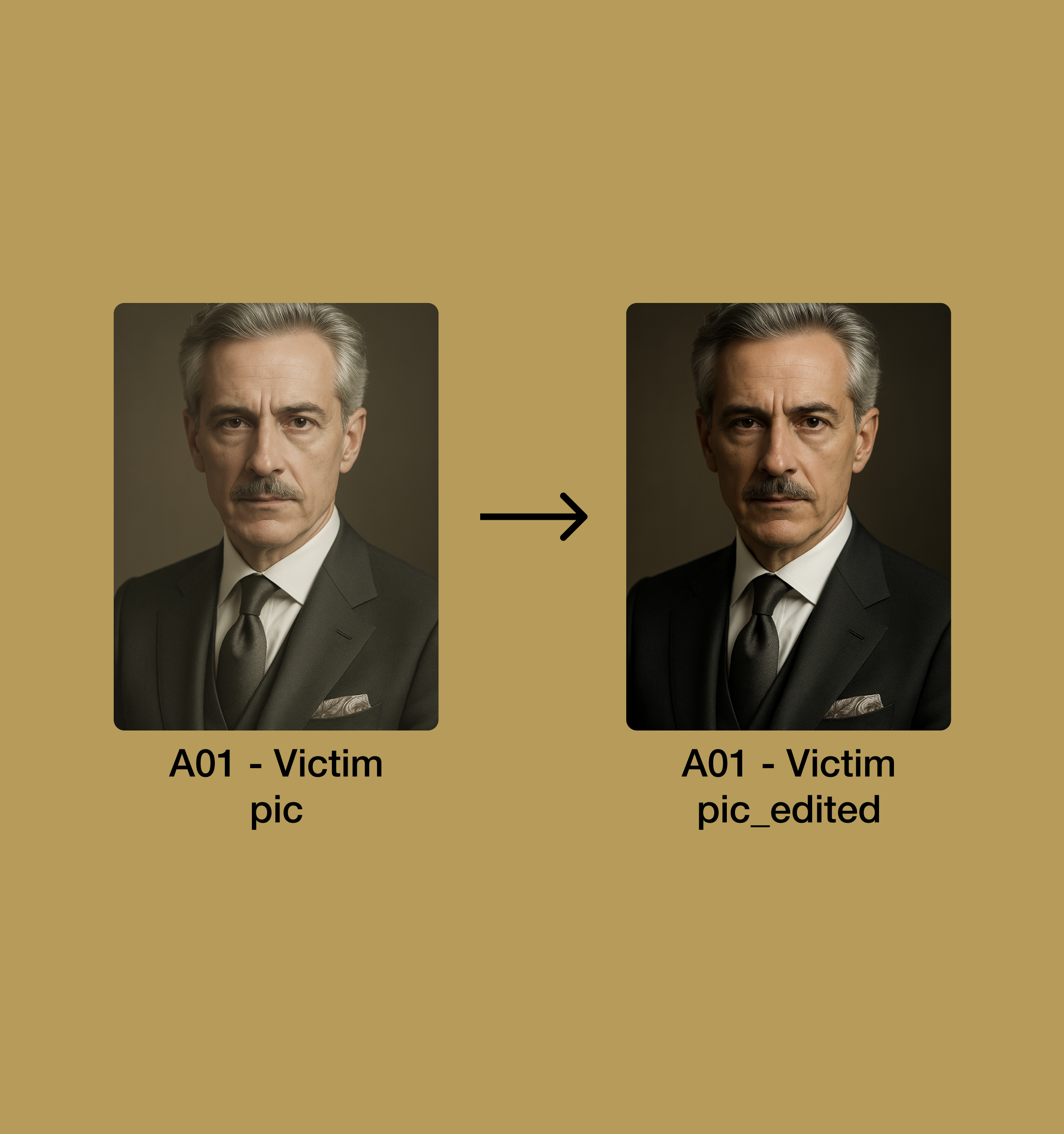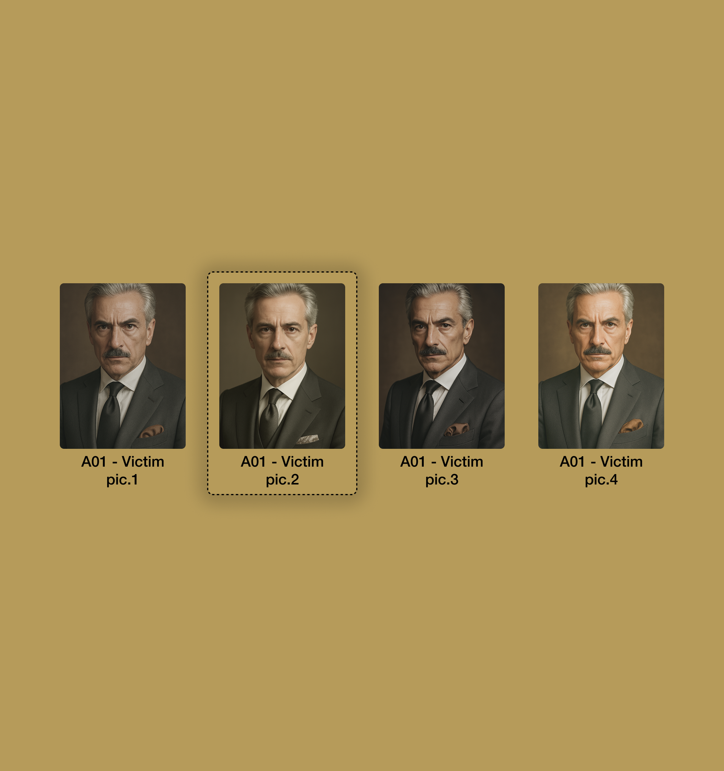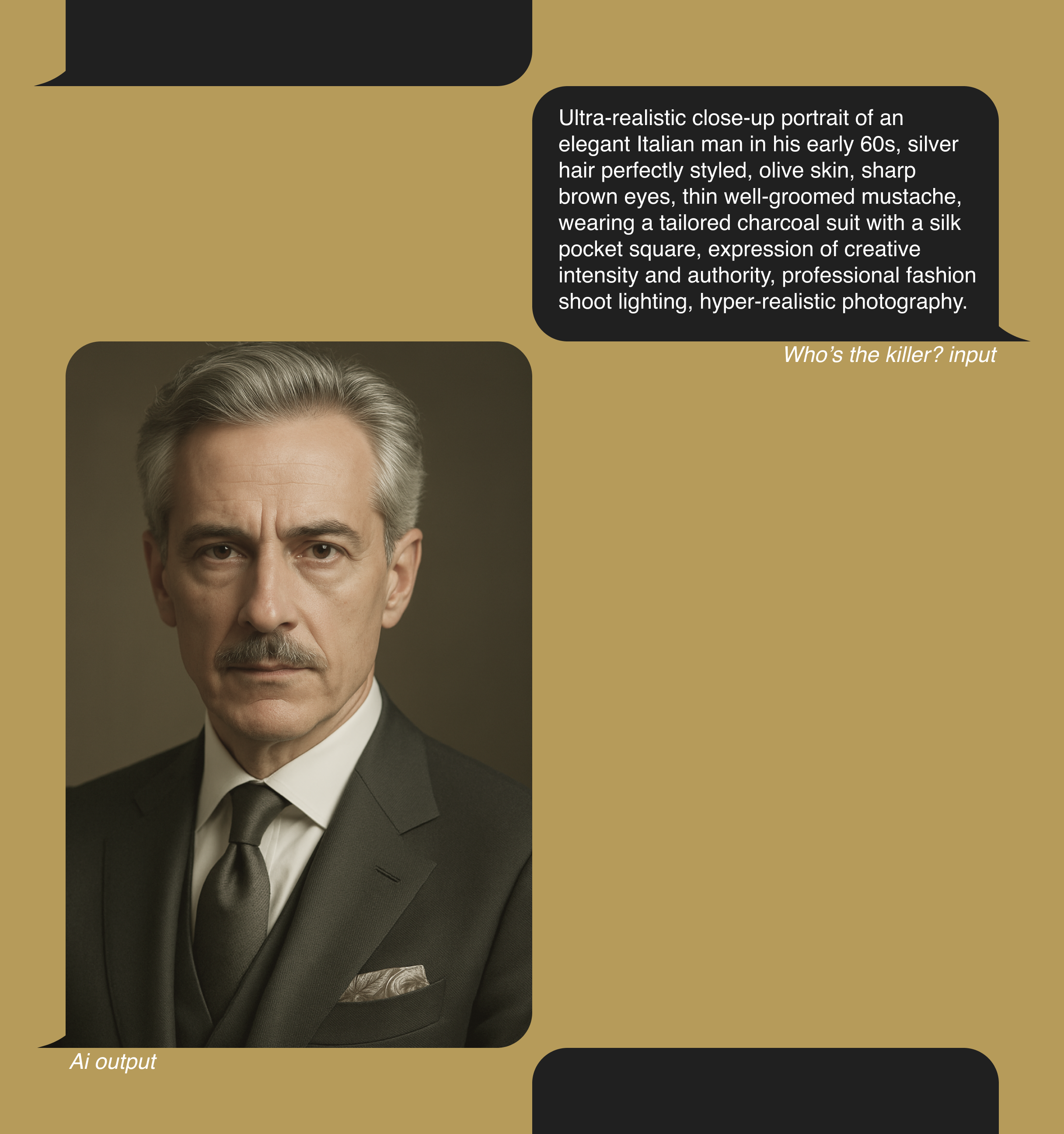 Who's the killer? è un progetto indipendente nato dal desiderio di raccontare storie, creare misteri e dare vita a esperienze da vivere insieme, attorno a un tavolo. Ogni caso, ogni immagine, ogni dettaglio è il risultato di un processo in cui convivono passione, sperimentazione e design. Non siamo uno studio grande: siamo una piccola realtà che crede nell’equilibrio tra artigianalità e tecnologia, tra il tocco umano e la curiosità per il futuro. In questa pagina ti raccontiamo come nasce un caso di Who's the killer? passo dopo passo.