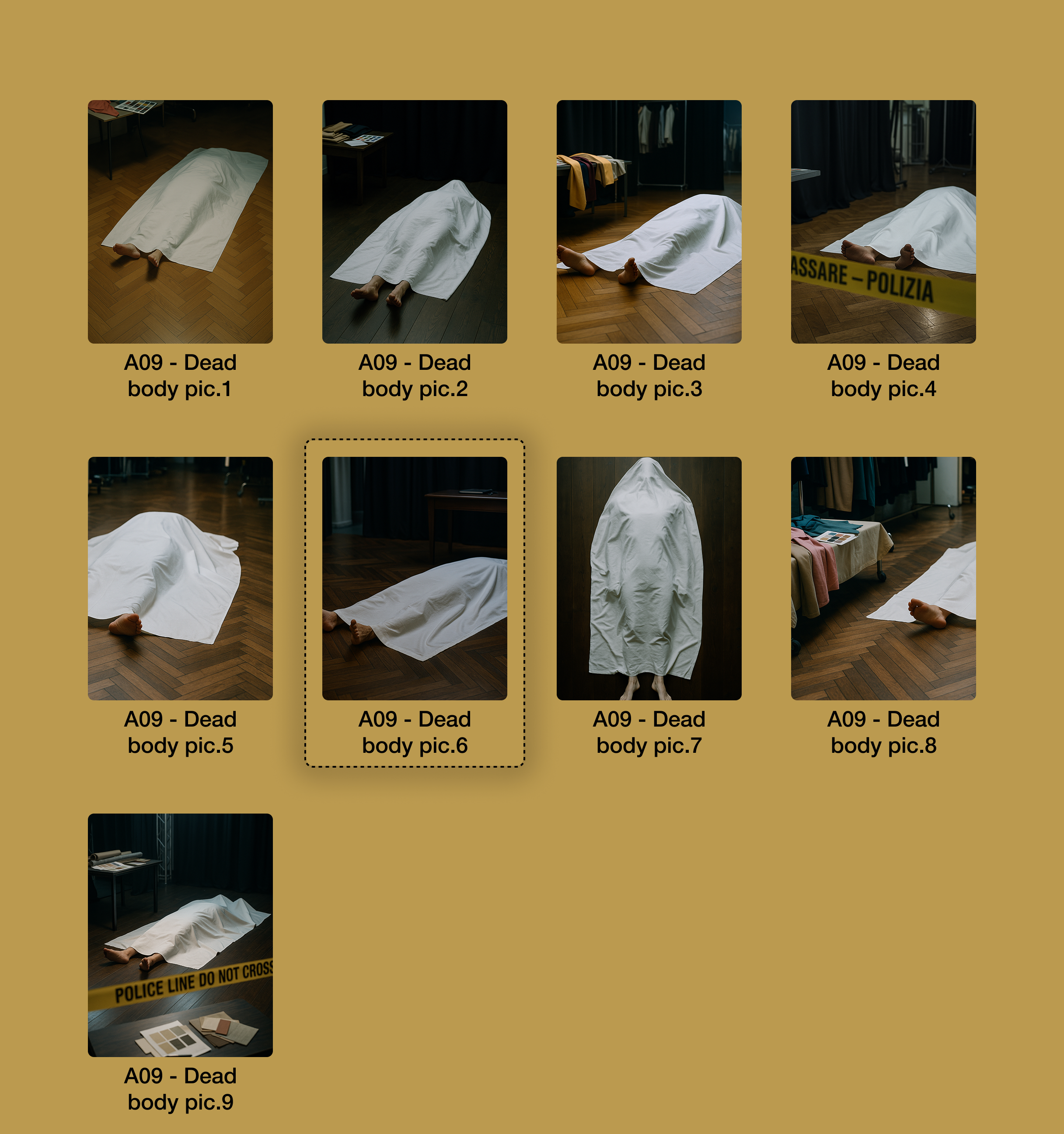 Le immagini di Who's the killer? nascono da una combinazione di strumenti digitali e intervento umano. Alcune foto sono realizzate con l’aiuto di intelligenza artificiale generativa, poi rifinite e integrate manualmente. Questa scelta nasce da motivi di sostenibilità produttiva: per una piccola realtà come la nostra, realizzare servizi fotografici professionali per ogni scena sarebbe oggi proibitivo. L’AI ci permette di esplorare scenari visivi impossibili da ricreare, mantenendo comunque un controllo umano su stile, atmosfera e coerenza narrativa. Crediamo che il futuro del design passi da qui: tecnologia come strumento, non come sostituto.